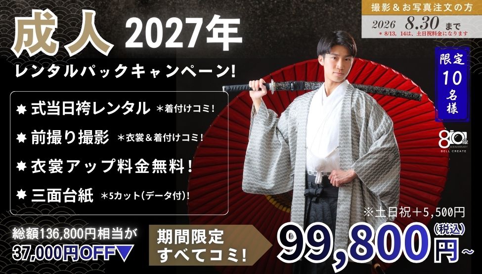 スーツ・袴2027年成人男子・袴レンタルパックキャンペーン!